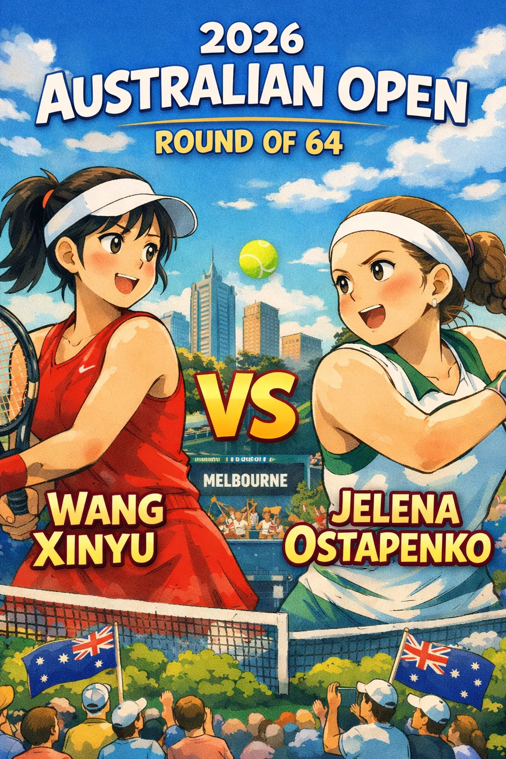 2026 Australian Open 여자 단식 64강(2라운드)에서 중국의 왕신우(Wang Xinyu)가 라트비아의 엘레나 오스타펜코(Elena Ostapenko)를 4-6, 6-4, 6-4로 꺾으며 32강에 진출했습니다.