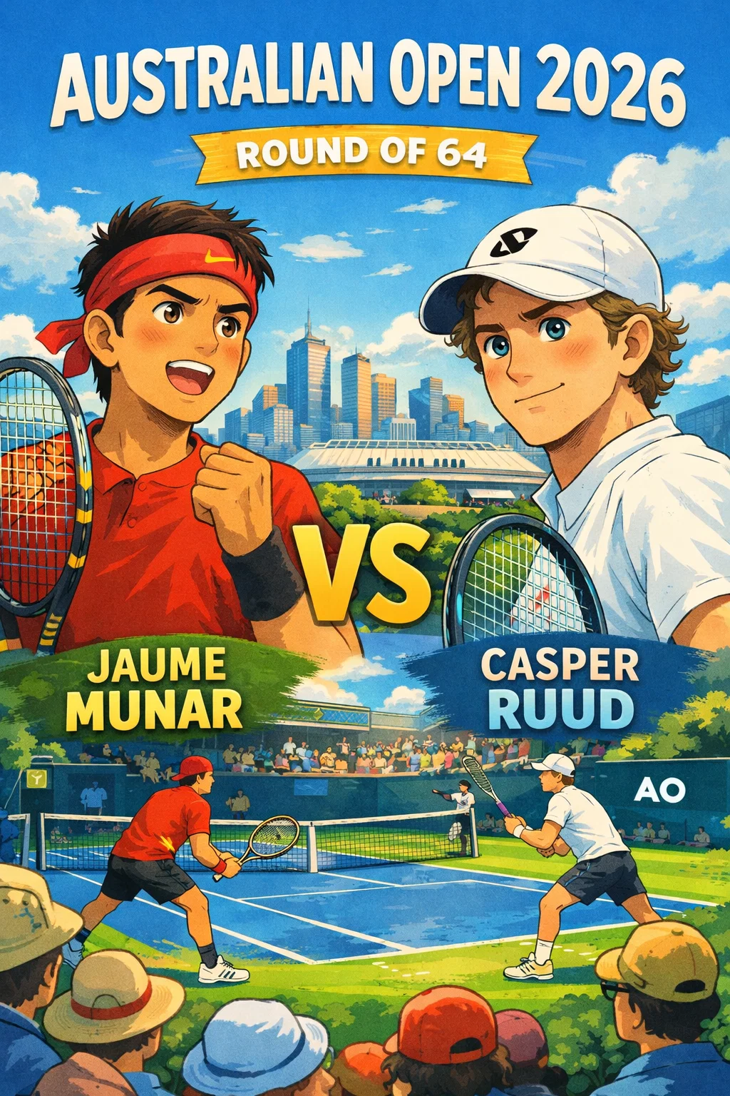 매년 1월 폭염 속에 펼쳐지는 그랜드 슬램 첫 대회로, 로드 레이버 아레나와 하이센스 아레나의 개폐식 지붕이 선수들을 보호합니다. 오늘은 64강 남자 단식에서 2번 시드 케스퍼 루드(Casper Ruud, 2025년 8월 ATP 랭킹 13위)가 스페인 하우메 무나르(Jaume Munar, 랭킹 39위)를 6-3, 7-5, 6-4로 직세트 승리한 경기를 깊이 분석합니다.