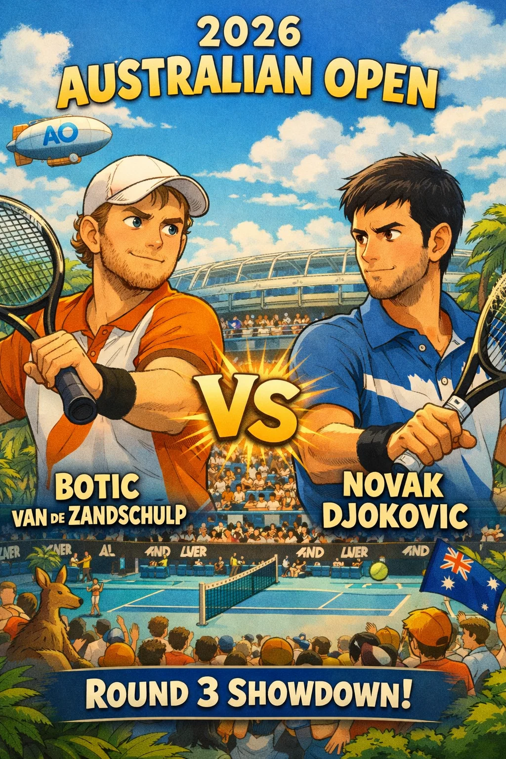 2026 호주 오픈 R32에서 노박 조코비치는 서브 에이스 12개, 포핸드 위너 22개로 보틱 반 데 잔드슐프를 6-3 6-4 7-6(4) 제압하며 챔피언십 폼 과시했습니다.
