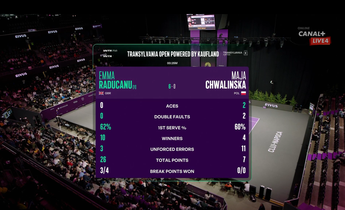 라두카누의 포핸드 크로스(평균 속도 85km/h)가 흐발린스카 백핸드 약점 공략. 외신 Sofascore "라두카누, 13게임 연속 승리 모멘텀".