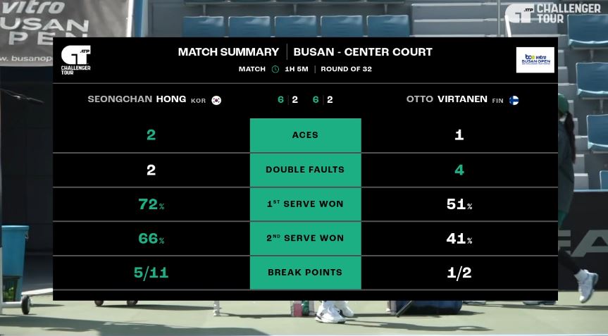 빠르게 경기가 진행되며 6:2로 홍성찬 선수가 승리하게 됩니다.