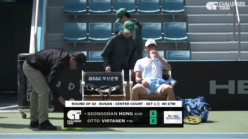 홍성찬 선수가 여유 있는 경기를 보여주며 5:2 상황이 됩니다.