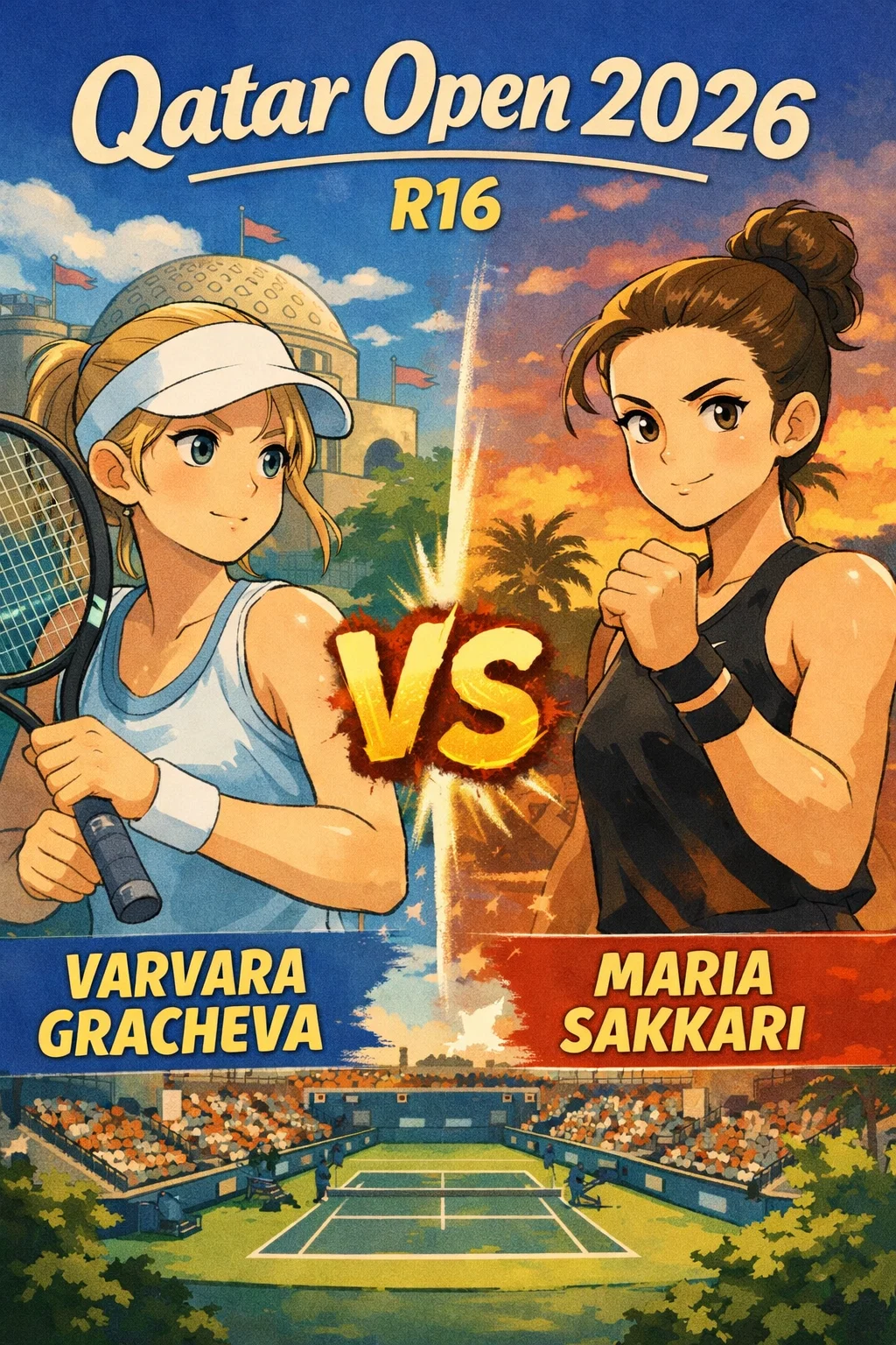 2026 카타르 오픈 R16에서 마리아 사카리는 서브 에이스 9개, 포핸드 위너 24개로 바르바라 그라체바를 6-7(4), 6-0 완파하며 8강 티켓 거머쥐었다.